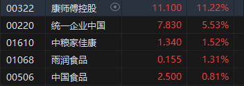 食物股集体冲高,康师父控股涨超11%。音讯面上,高盛引述康师父管理层指昨年销量或会受到涨价影响(昨年10月起简短面价钱上调),但料昨年纯利增长主张(10%至15%)有上行后劲。2025年瞻望方面,康师父但愿2025年营收将踏实成长,且净利润率将执续改善。另外,大摩督察康师父控股“增执”评级,主张价降至11.3港元。